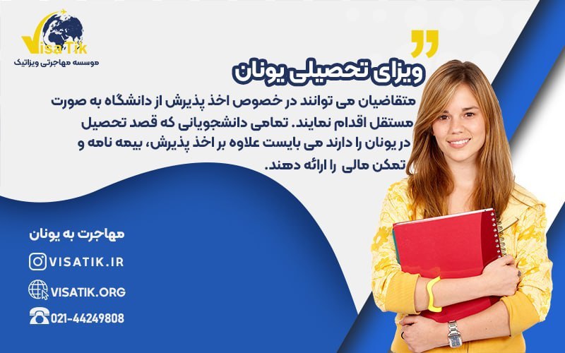 متقاضیان می توانند در خصوص اخذ پذیرش از دانشگاه به صورت مستقل اقدام نمایند. تمامی دانشجویانی که قصد تحصیل در یونان را دارند می بایست علاوه بر اخذ پذیرش، بیمه نامه و تمکن مالی را ارائه دهند..